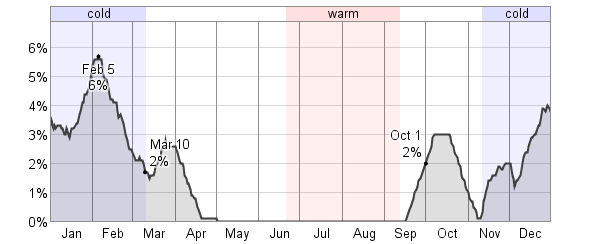 The time of the year between July 2 and August 14 is the most comfortable, with dew points that are neither too dry nor too muggy.