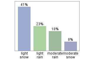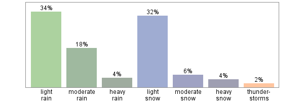 The fraction of days in which various types of precipitation are observed. If more than one type of precipitation is reported in a given day, the more severe precipitation is counted. For example, if light rain is observed in the same day as a thunderstorm, that day counts towards the thunderstorm totals. The order of severity is from the top down in this graph, with the most severe at the bottom.
