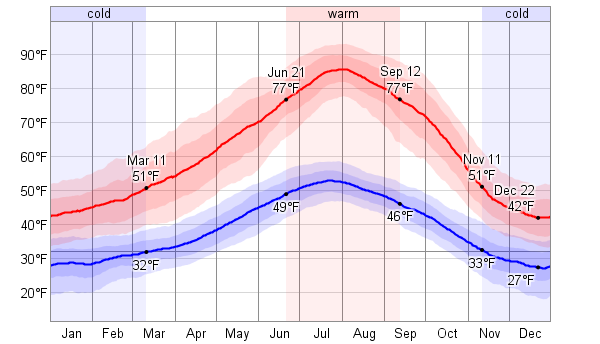 The warm season lasts from June 21 to September 12 with an average daily high temperature above 77°F. The hottest day of the year is July 30, with an average high of 86°F and low of 53°F.