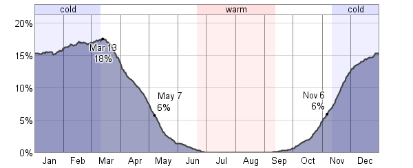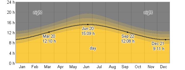 The length of the day varies significantly over the course of the year. The shortest day is December 21with 9:11 hours of daylight; the longest day is June 20 with 15:09 hours of daylight.