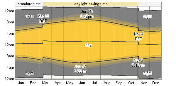 The solar day over the course of the year 2012 . From bottom to top, the black lines are the previous solar midnight, sunrise, solar noon, sunset, and the next solar midnight. The day, twilights (solar, civil, nautical, and astronomical), and night are indicated by the color bands from yellow to gray. The transitions to and from daylight saving time are indicated by the "DST" labels.