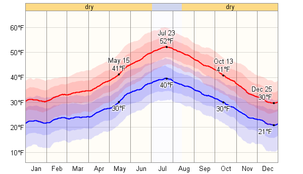 Over the course of a year, the temperature typically varies from 27°F to 86°F and is rarely below 18°F or above 93°F.
