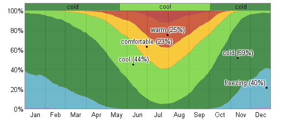 The average fraction of time spent in various temperature bands: frigid (below 15°F), freezing (15°F to32°F), cold (32°F to 50°F), cool (50°F to 65°F), comfortable (65°F to 75°F), warm (75°F to 85°F), hot (85°F to 100°F) and sweltering (above 100°F).