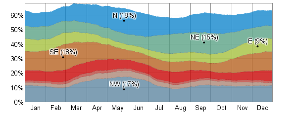 The fraction of time spent with the wind blowing from the various directions on a daily basis. Stacked values do not always sum to 100% because the wind direction is undefined when the wind speed is zero.