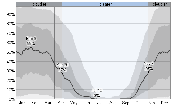 The median cloud cover ranges from 0% (clear) to 55% (partly cloudy). The sky is cloudiest on February 6and clearest on July 10. The clearer part of the year begins around April 20. The cloudier part of the year begins around November 9.