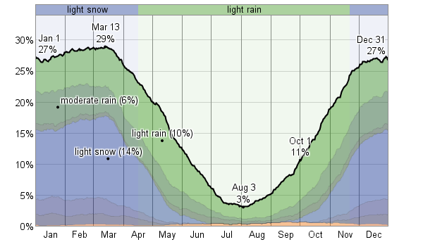The probability that precipitation will be observed at this location varies throughout the year. Precipitation is most likely around March 13, occurring in 29% of days. Precipitation is least likely around August 3, occurring in 3% of days.