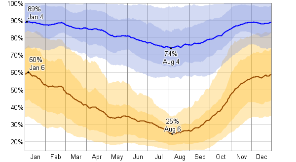The average daily high (blue) and low (brown) relative humidity with percentile bands (inner bands from 25th to 75th percentile, outer bands from 10th to 90th percentile).