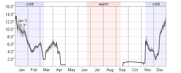 The snow is typically at its deepest on January 3, with a median depth of 13.3"; the depth exceeds 14.1"only one year out of ten.