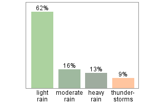 Light rain is the most severe precipitation observed during 34% of those days with precipitation. It is most likely around May 11, when it is observed during 10% of all days.