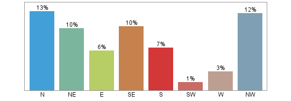 The wind is most often out of the north (13% of the time), north west (12% of the time), and south east(10% of the time). The wind is least often out of the south west (1% of the time) and west (3% of the time).